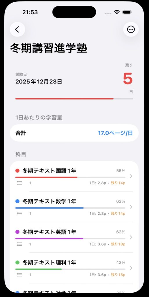 今までは試験までに何をクリアしなければいけないのか、どうすれば目標としている点数を取れるのか、けっこう漠然としてしまうことが多かったのですが、試験範囲を渡されてからまずすべての必要情報をアプリに入れることで、1日あたり何をすればいいのか、どこまで進めればいいのかが明確になりました。そのおかげで、目標達成までの行動を起こしやすくなった気がします。
